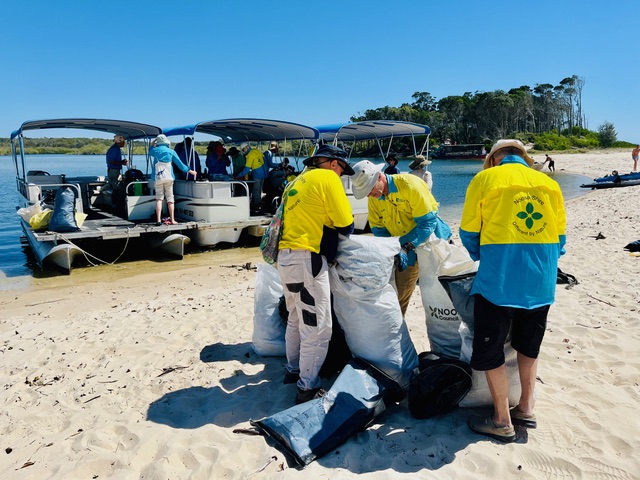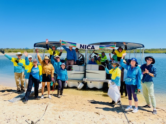 On 29 April, 22 volunteers went on 2 pontoon boats to Sand Island in the Noosa River Estuary. Sand island and its associated sand spits are critical habitat for both migratory (from Alaska and Siberia) and resident shorebirds. NICA volunteers have been successfully rehabilitating the island by removing invasive weeds since 2010. The island is off limits between October and the beginning of April. Noosa Council had contractors dredge and realign the river estuary to try and restrict erosion, so we looked at the effect that has had on the island and its vegetation and it joins North Shore, the risk to bird life from foxes and dogs. We discussed the importance the Mangroves and Saltmarsh but did not walk among them as resident shorebirds were nesting. A four-page hand out was emailed to the participants, prior to our visit.
