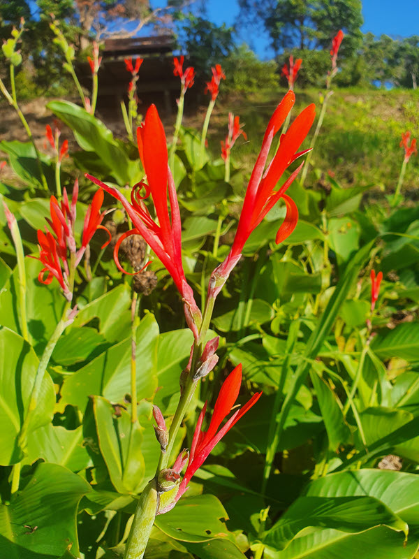 Canna lilies are a popular garden plant, often seen growing in drains along driveways. They usually have red flowers but can be orange. They grow in dense clumps and cause problems when they spread from the garden into the bush.